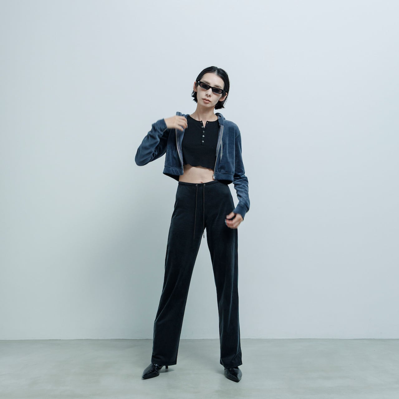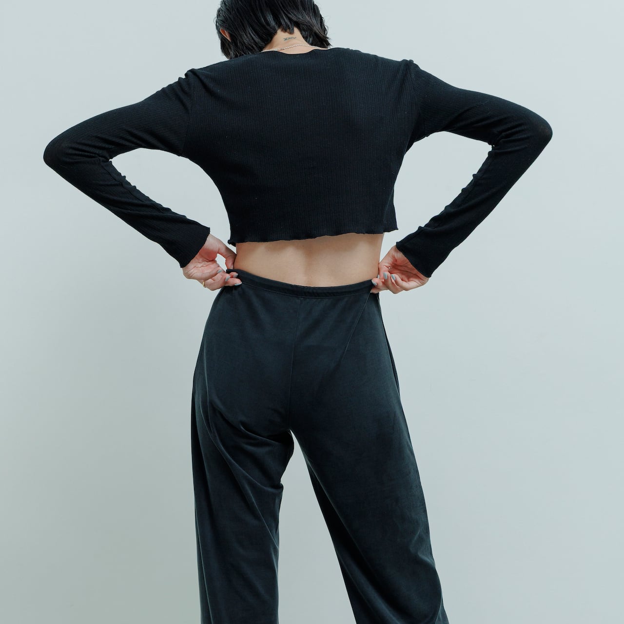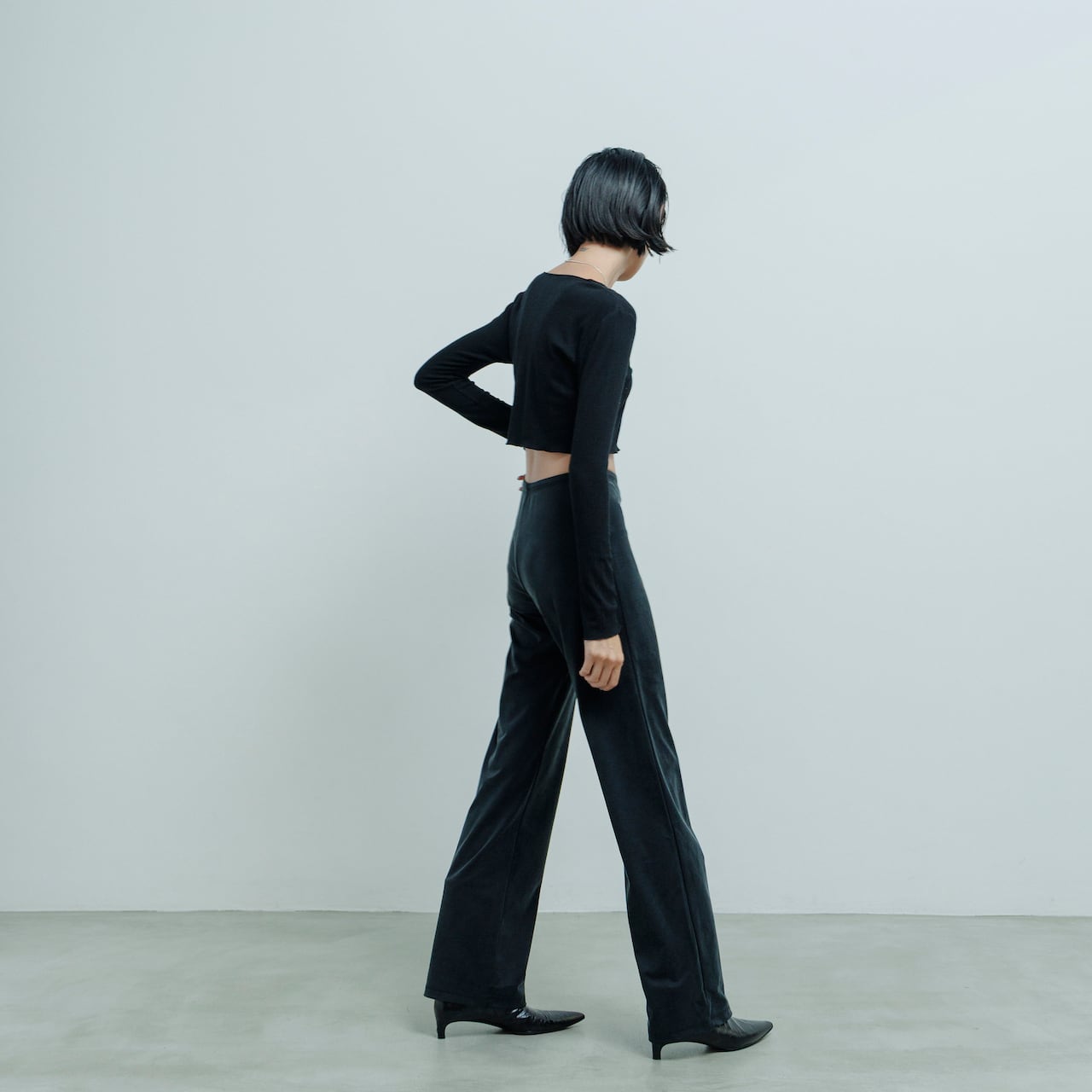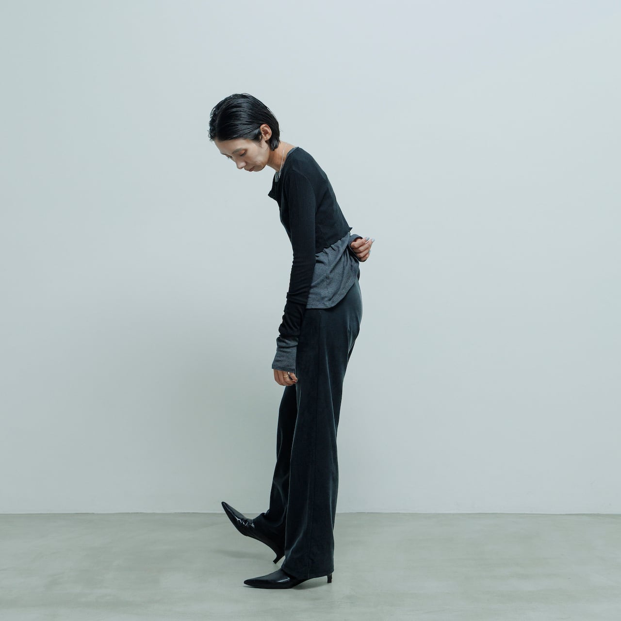 レーヨンとコットンが織り成す柔らかい肌触りで、落ち着いたブラックカラーはさらなる洗練を演出します。
