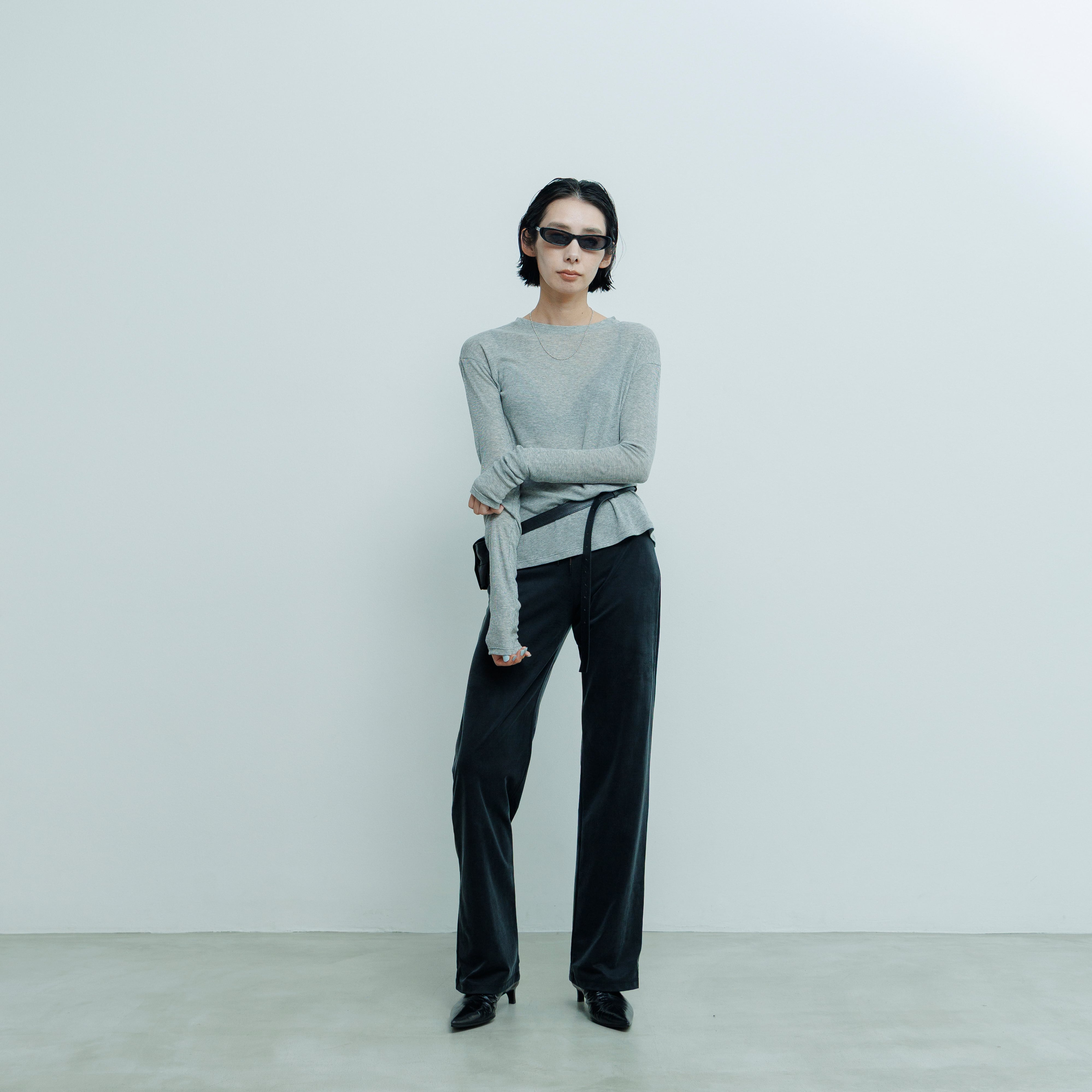 ウエストはすっきりと仕上げつつ、ヒップ周りにほど良くゆとりを持たせ、リラックス感と上品さを両立させました。ゴム+ドローストリング付きなのでストレスなく着用できるのも◎