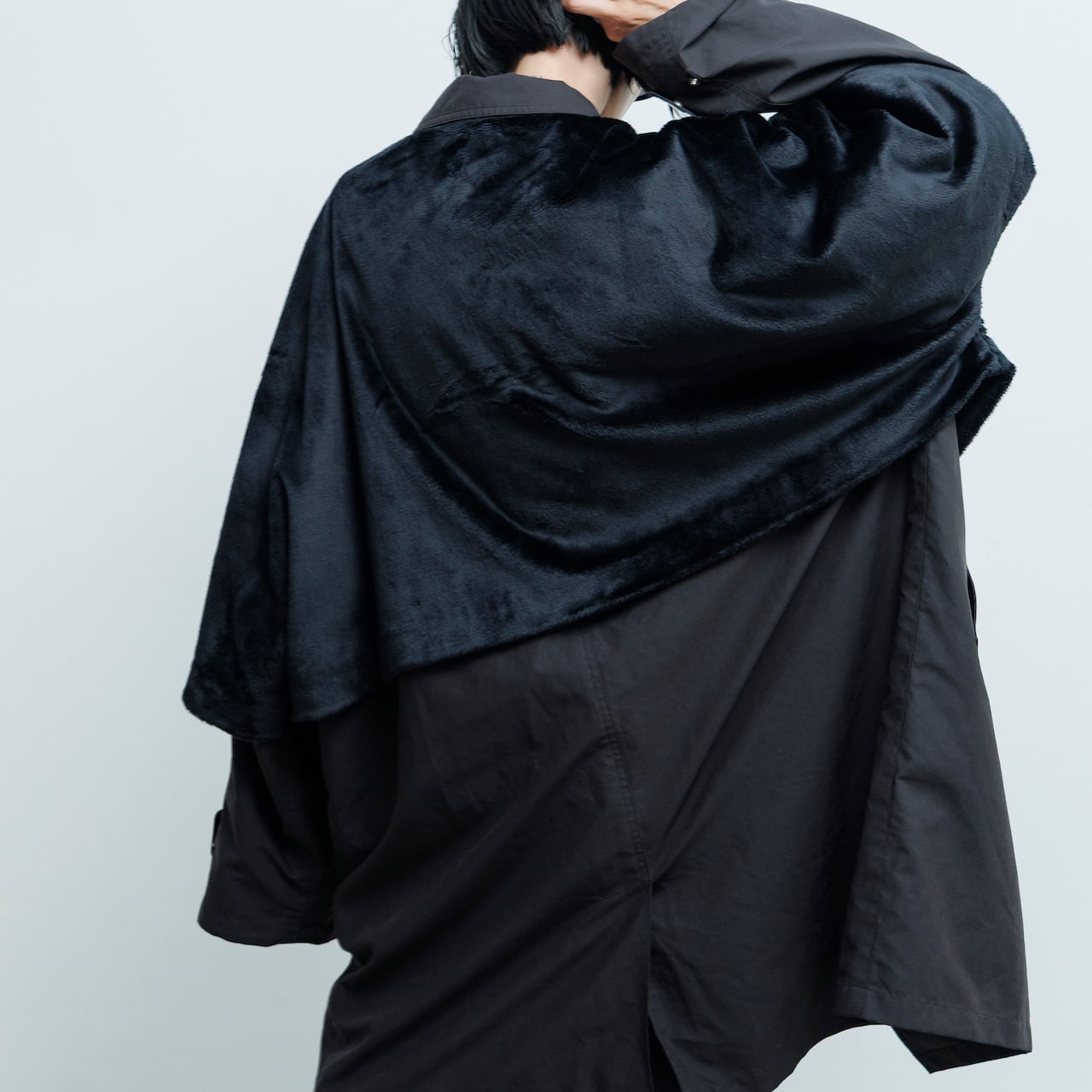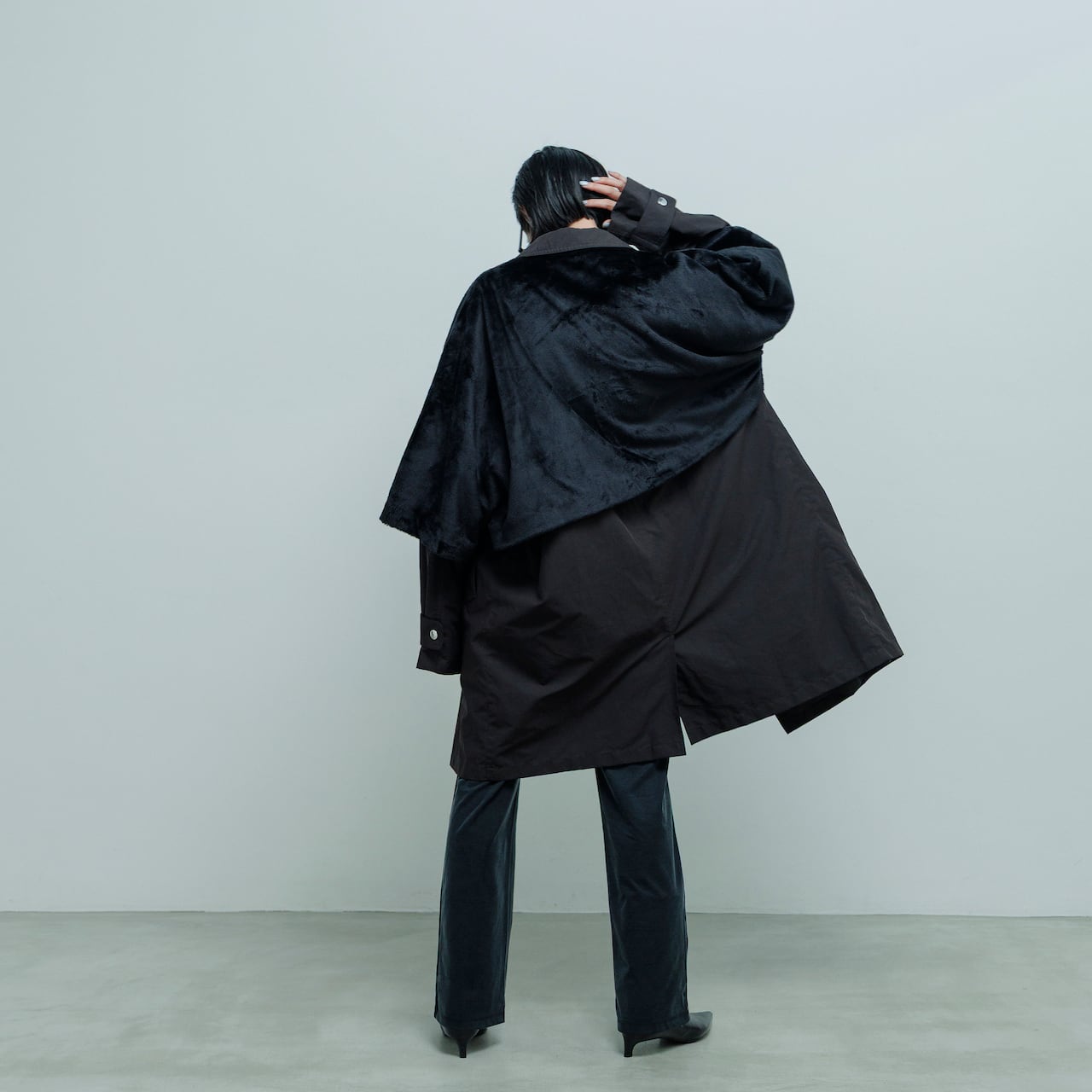 無機質な素材感とファーの温もりが共存するデザインで、ラグジュアリーでありながらモードにもストリートにも振れる自由な一着。肩を落としたオーバーサイズのシルエットは身体のラインをやわらかく包み込み、着る人の存在感を際立たせます。